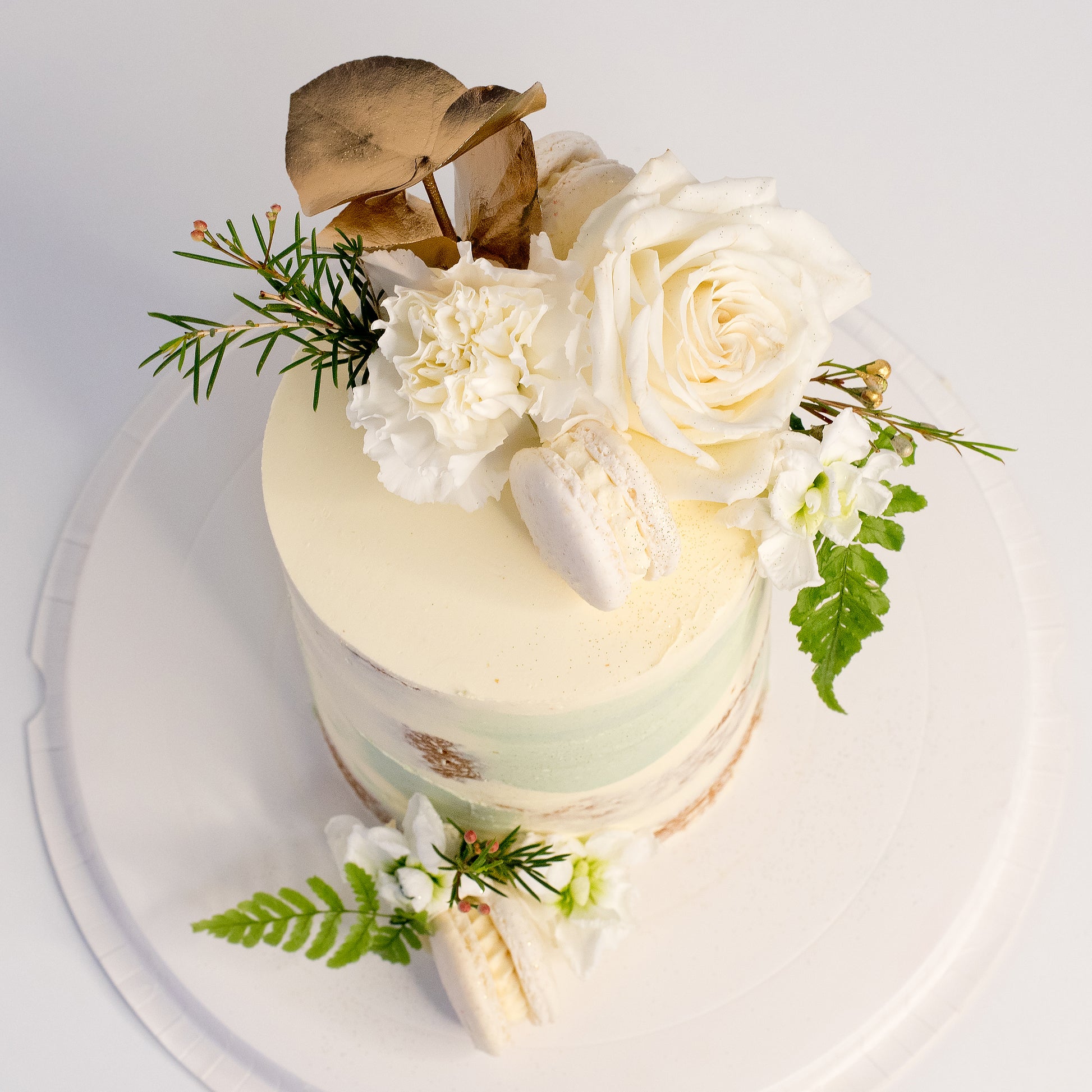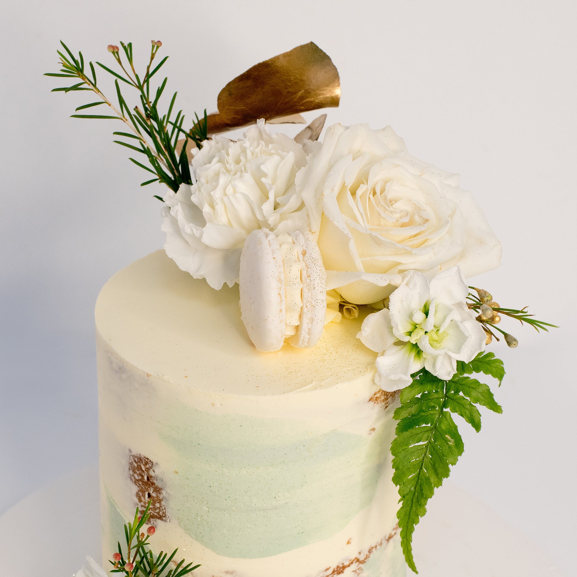 The Decorations: Adorning the cake are fresh flower in shades of whites and greens, while adding the touch of gold adds a natural elegance and a beautiful contrast to the creamy buttercream. These blooms bring a touch of freshness and sophistication to the design