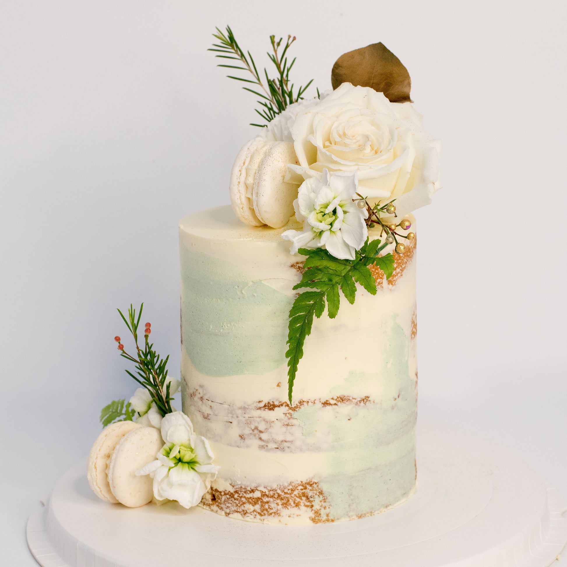 Macarons: Megan has three macarons, nestled among the blooms, These can come in shades of light green and white. - The Finishing Touches: Megan is finished with a dusting of edible glitter. These luxurious details add a shimmering, magical touch that makes the cake truly spectacular. The top of the cake is intentionally left with space for you to add a topper, making this cake perfect for weddings, anniversaries, birthdays, or any special celebration that requires a unique touch.