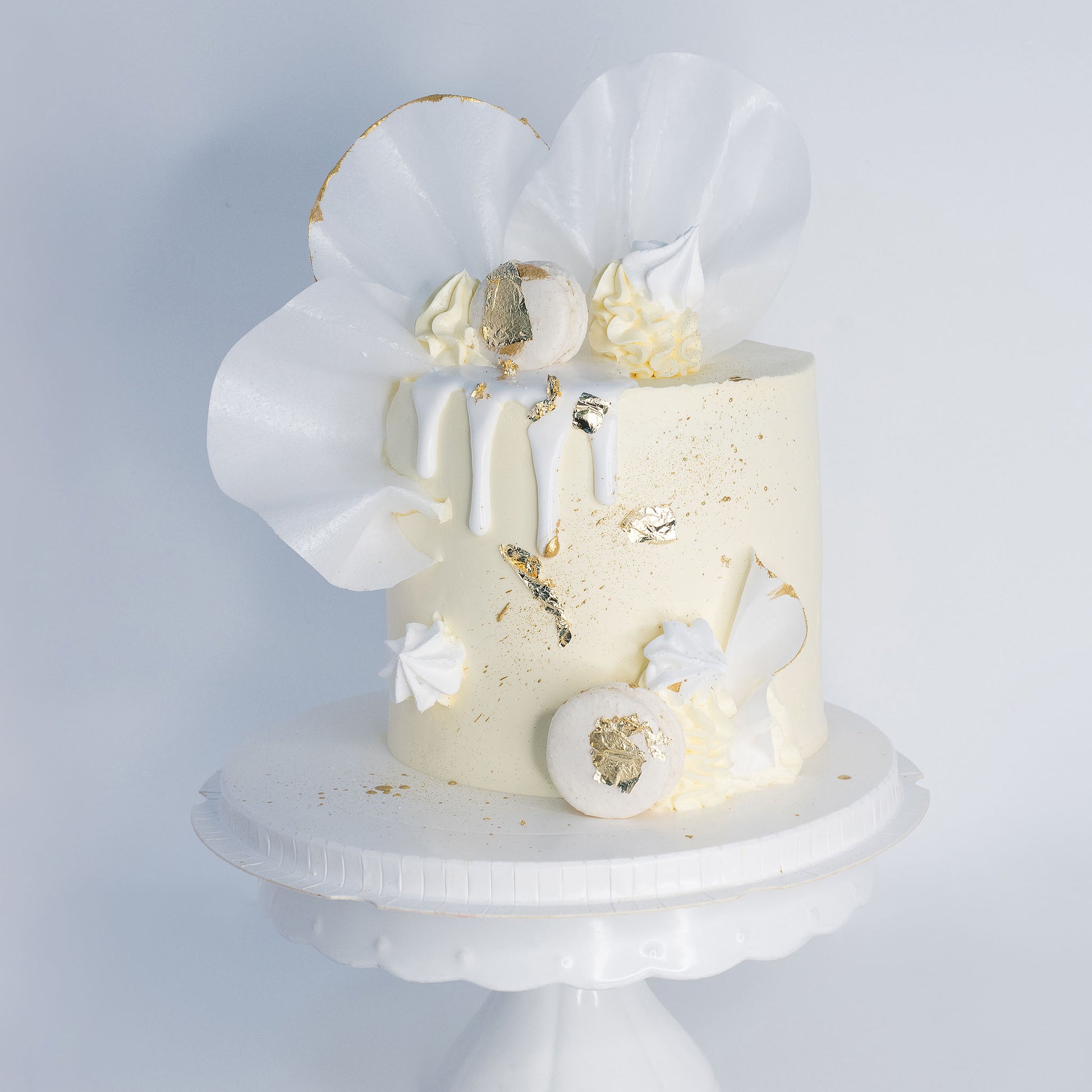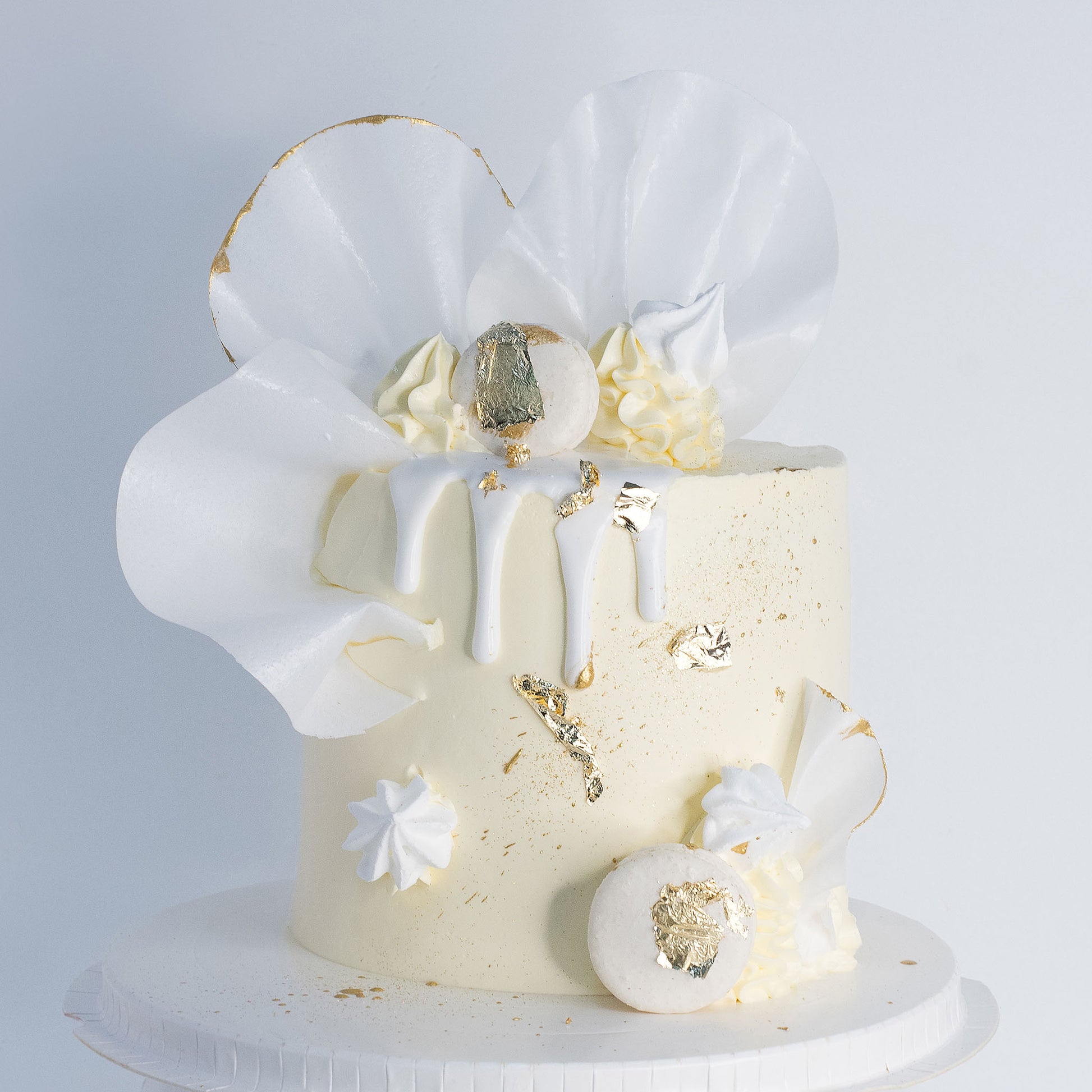 We then finish it off with wiggle piping and sweet melt in your mouth meringues. - The Finishing Touches: Sophia is finished with a dusting of edible glitter. These luxurious details add a magical touch that makes the cake truly spectacular.