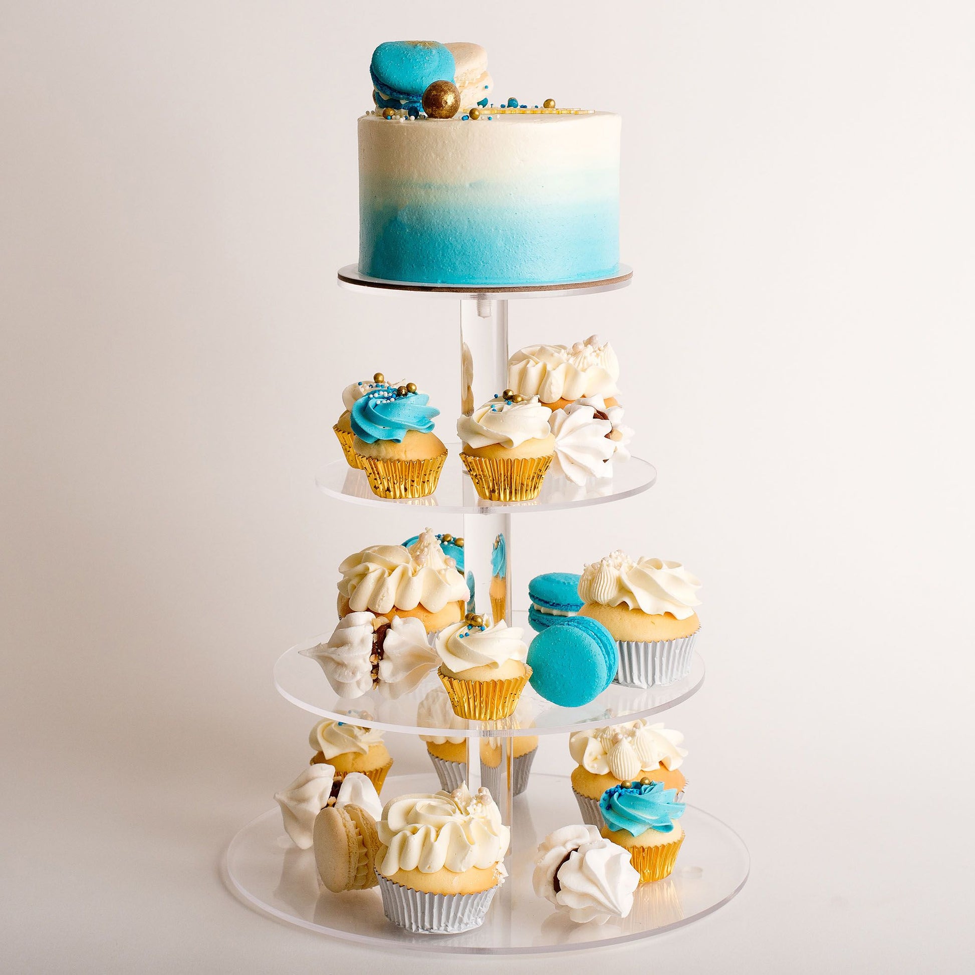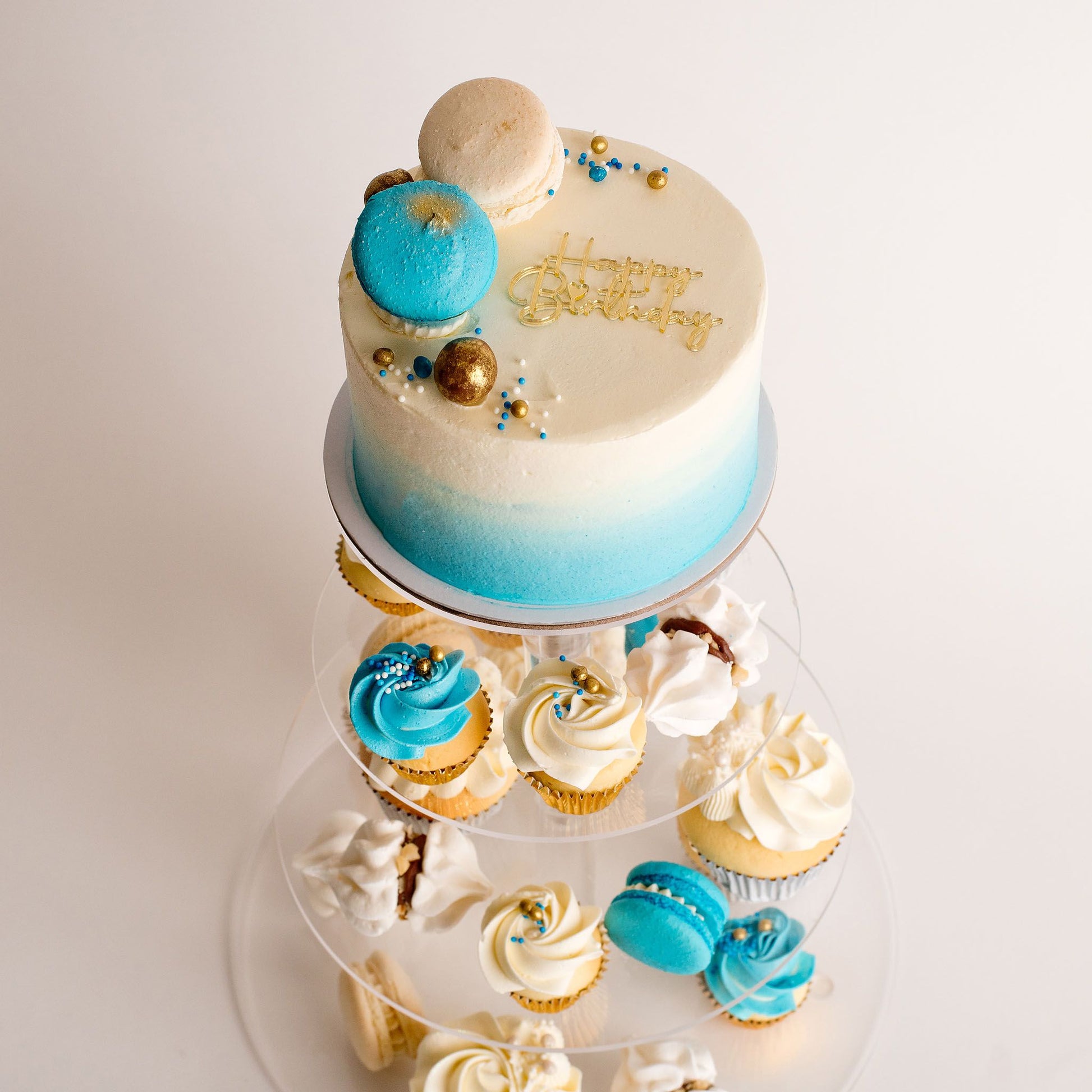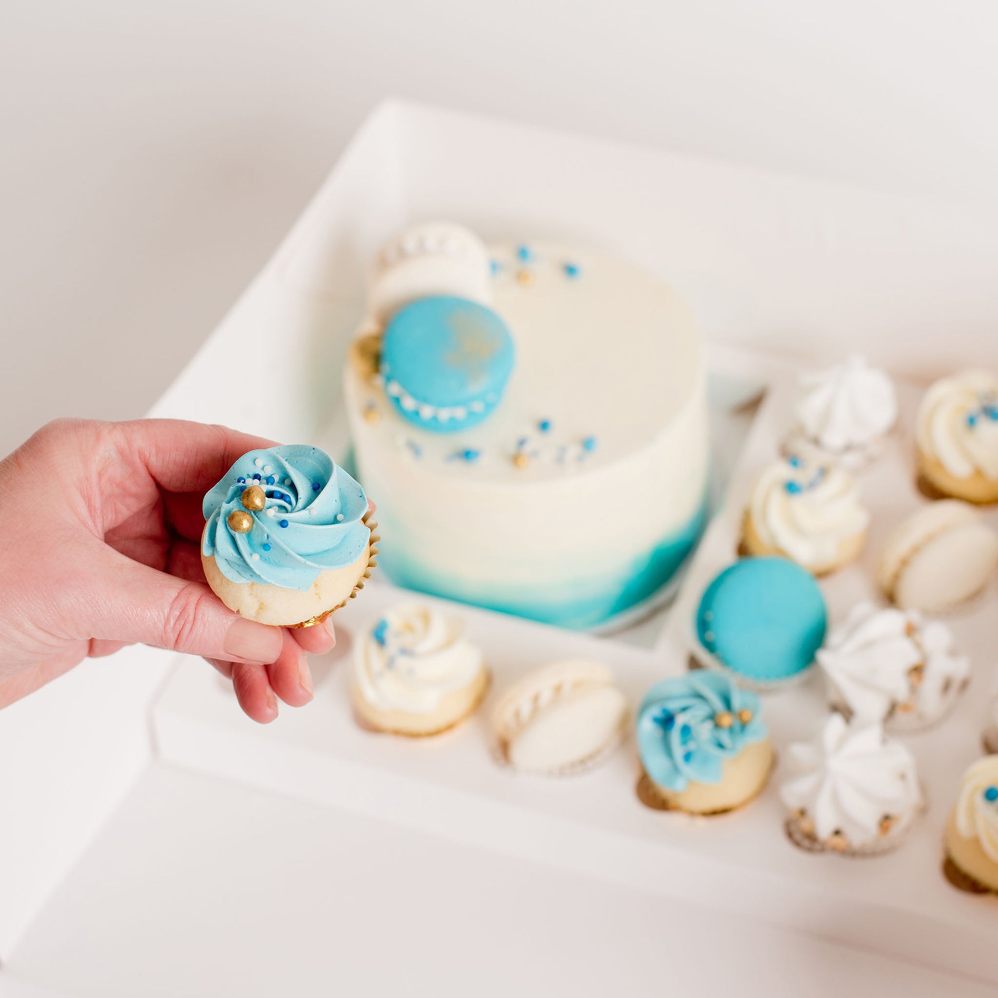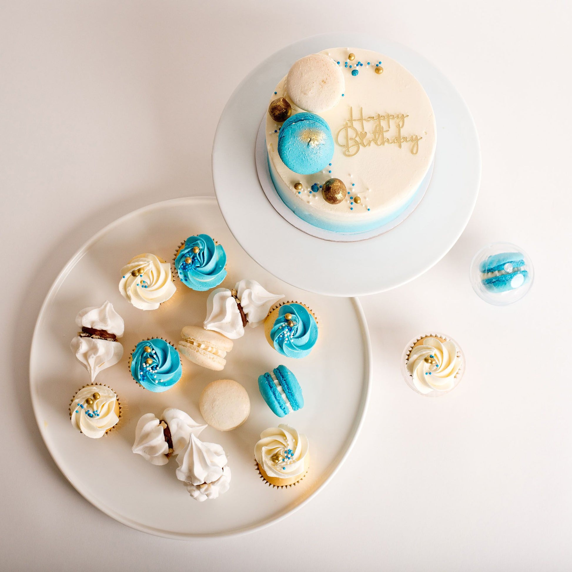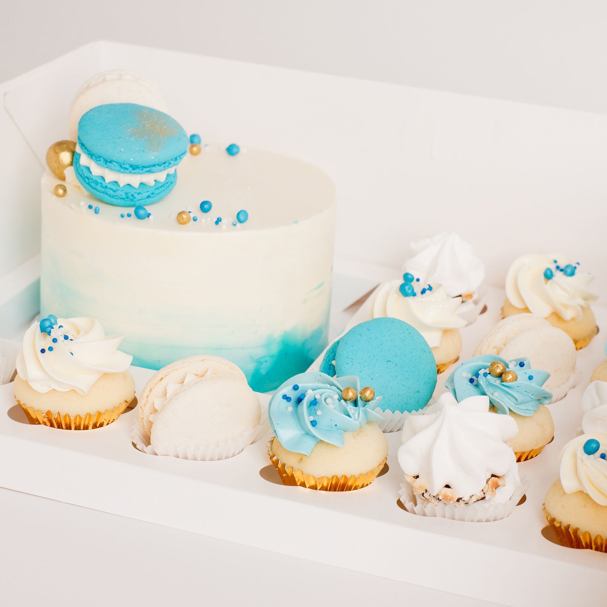 Main cake: A gorgeously decorated delightful size (half-height) main cake, covered in our signature Italian buttercream, renowned for its silky smooth texture and delicious, indulgent taste. Featuring blue ombre buttercream on the side of the cake. The top is decorated in two macarons - Blue and White - and medley of blue, white and gold small sprinkles, and edible crisp pearls.