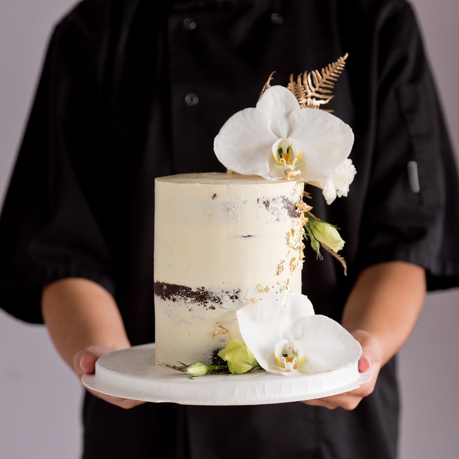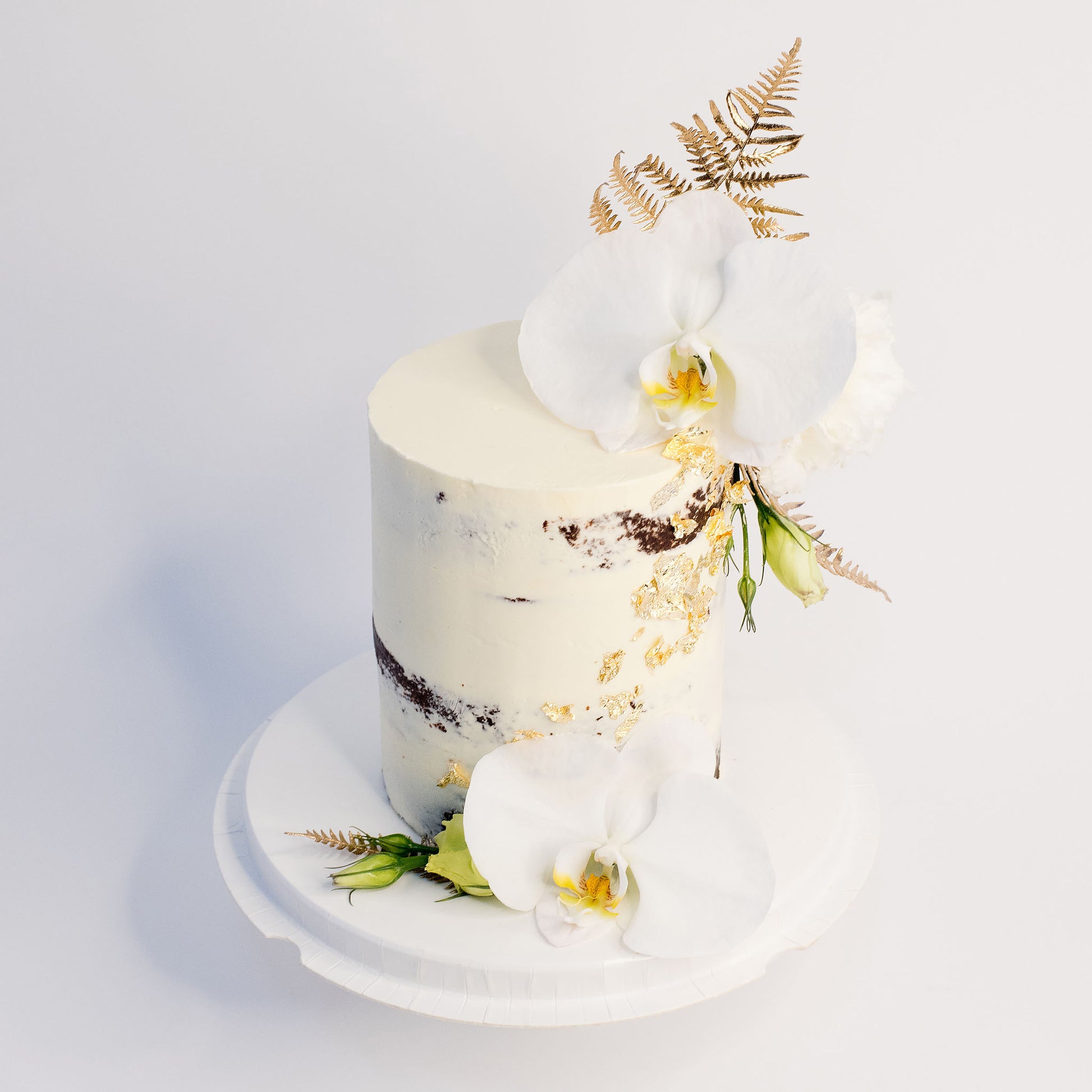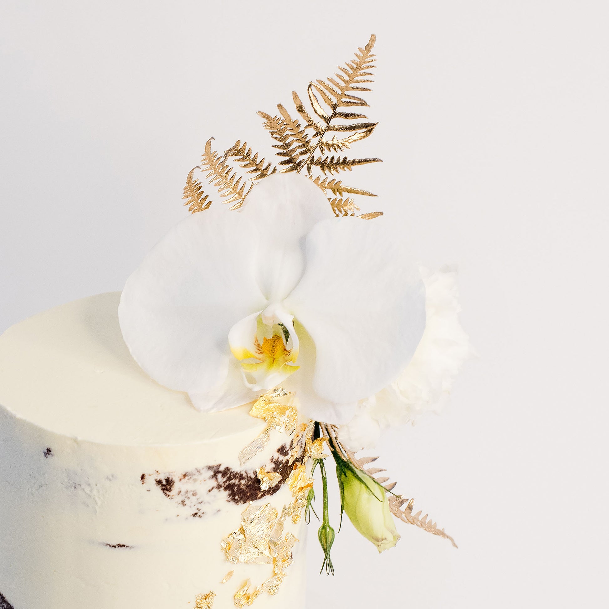 - The Decoration: The cake is gorgeously decorated with pristine white Phalaenopsis orchids, known for their timeless beauty and elegance. Complementing the orchids are delicate golden fern, adding a luxurious and contemporary touch to the overall design.