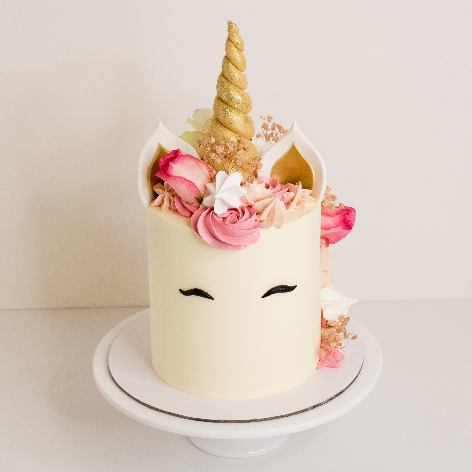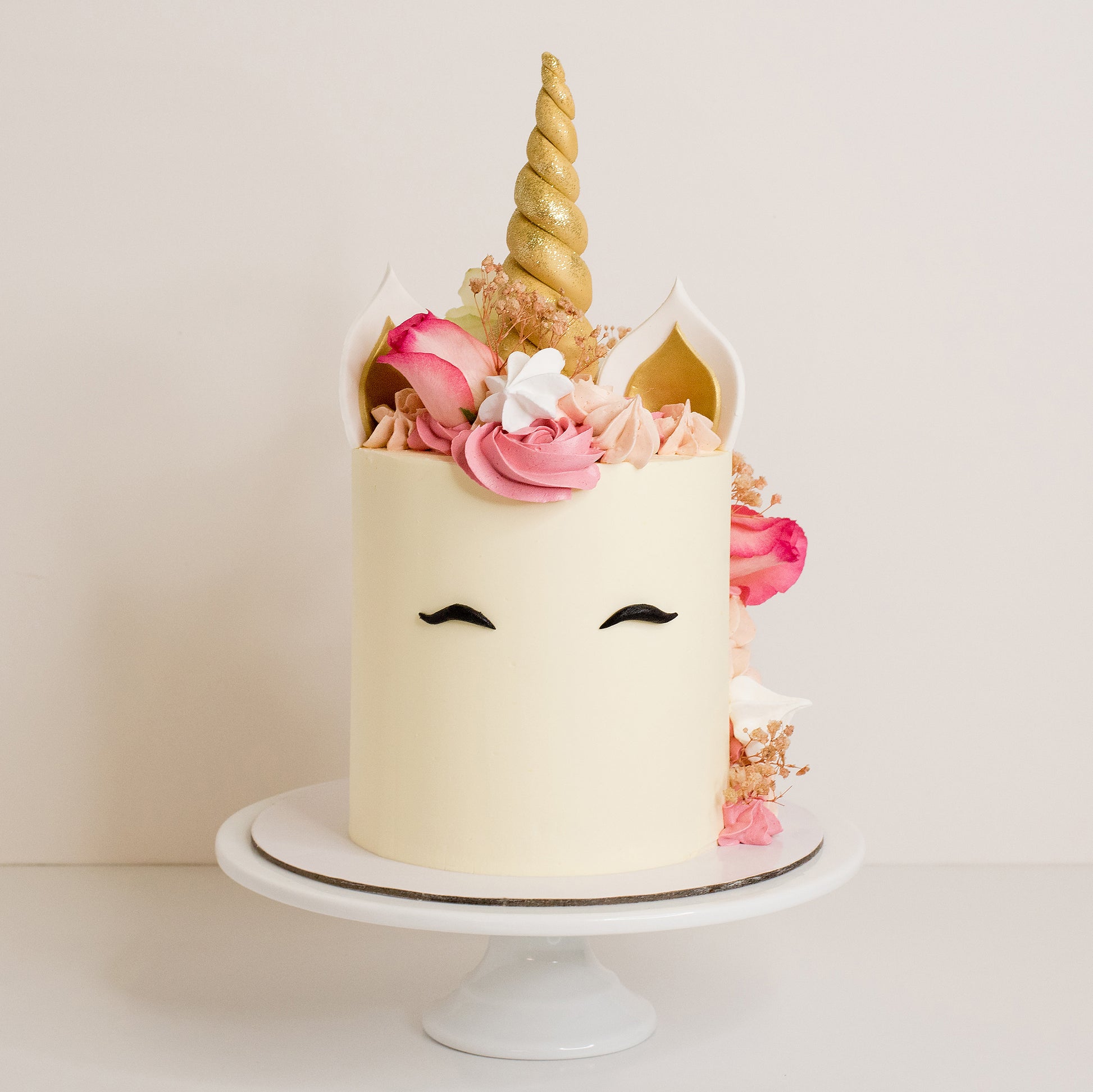 Unicorn Ears: Adorned with delicate, gold-lined unicorn ears, this cake brings the mythical creature to life in a charming and sophisticated way.