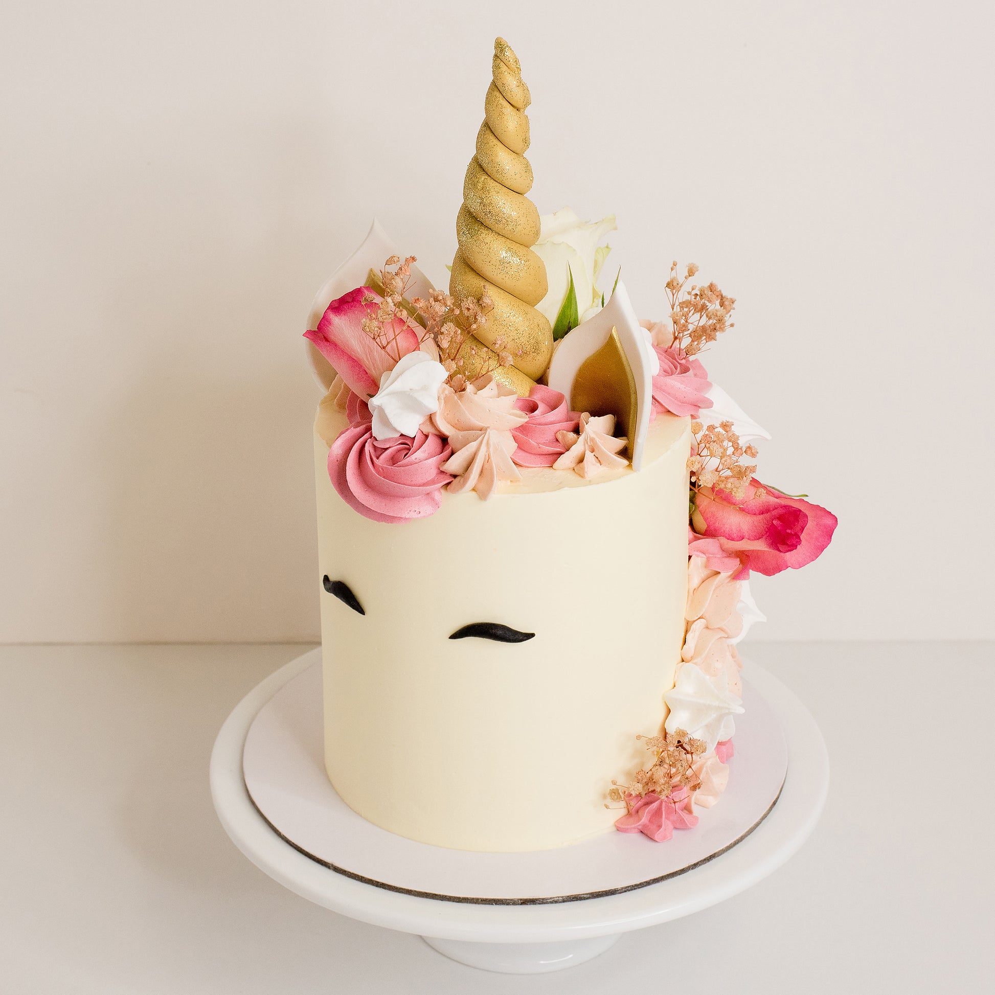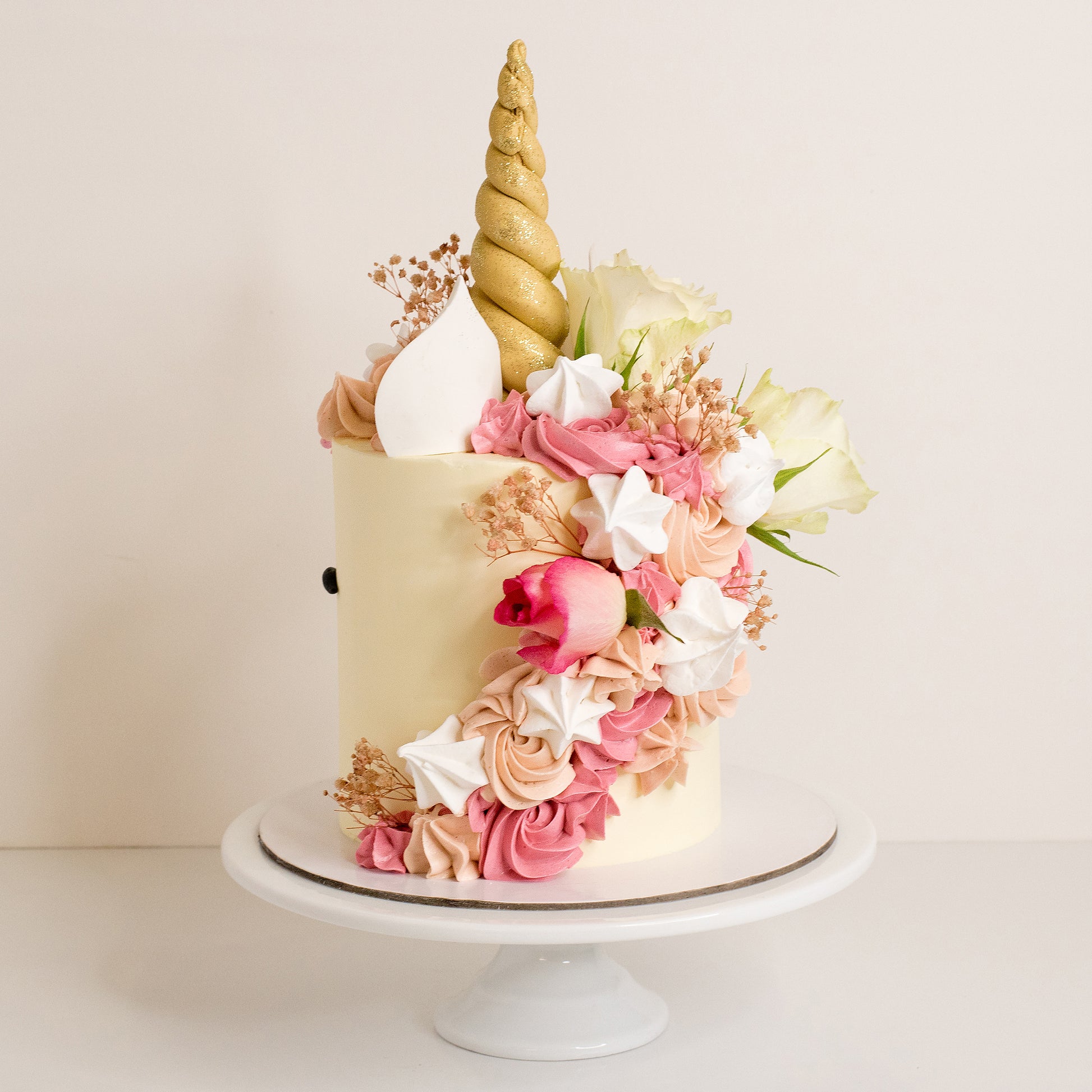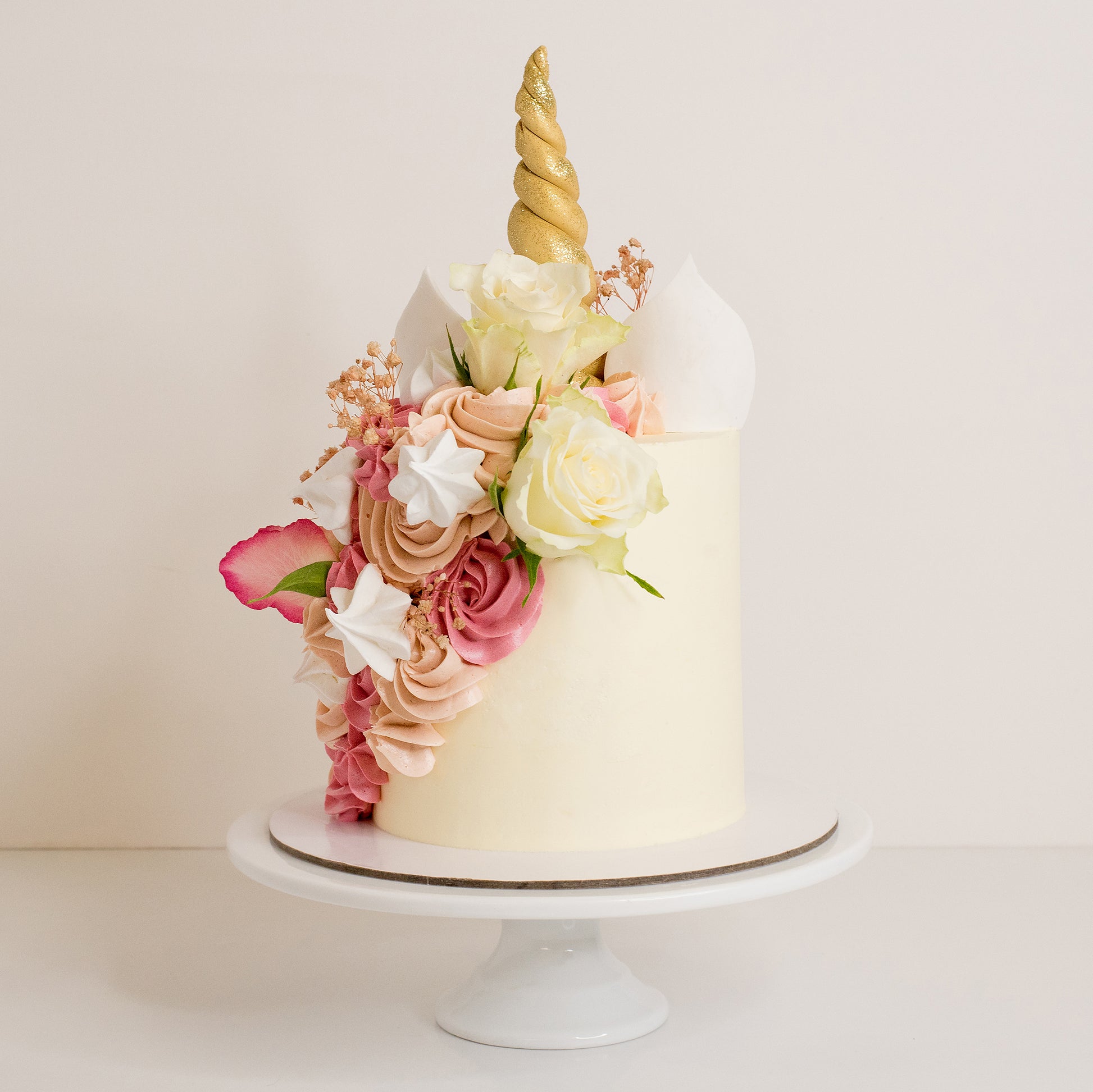 Floral Buttercream Mane: The top of the cake features a beautiful mane made of swirls of buttercream rosettes in shades of pinks and white, intwined with fresh flowers and meringue kisses. This beautiful mane adds a burst of colour and texture, making the cake visually stunning.