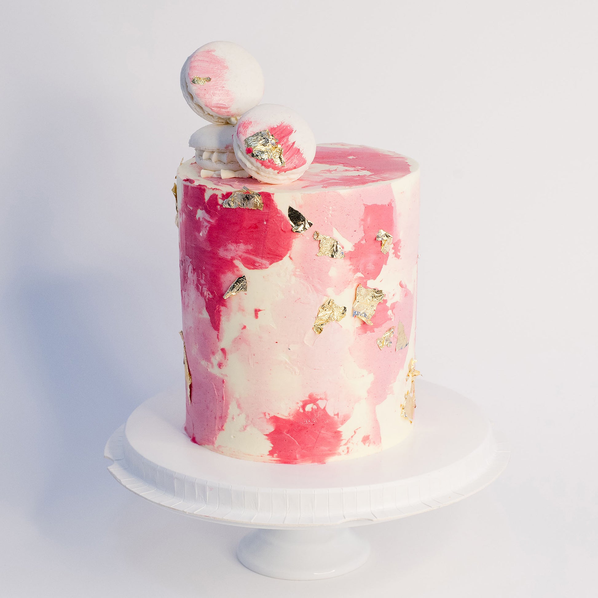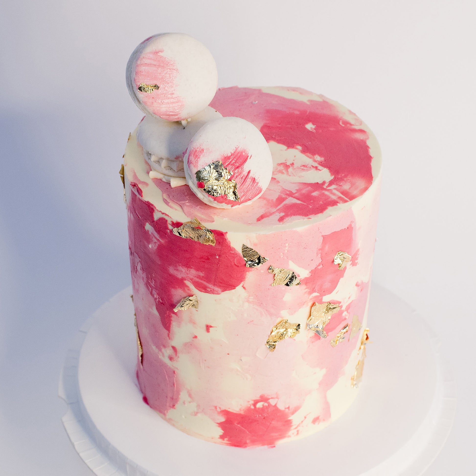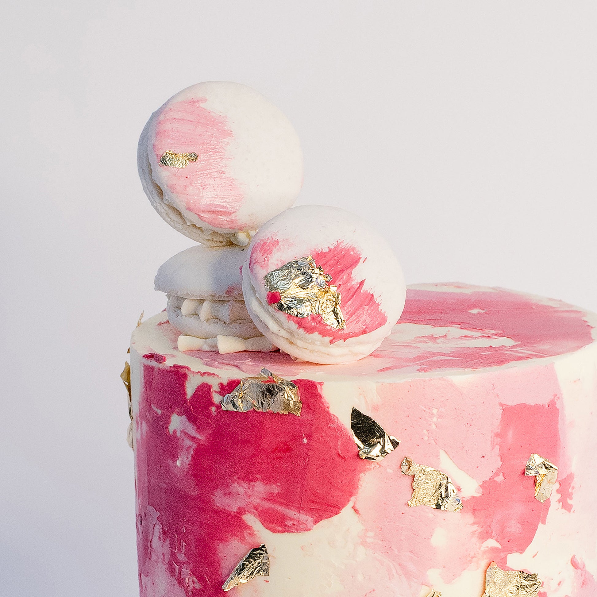 Macarons: Three strategically placed white macarons with painted stokes of pink buttercream.