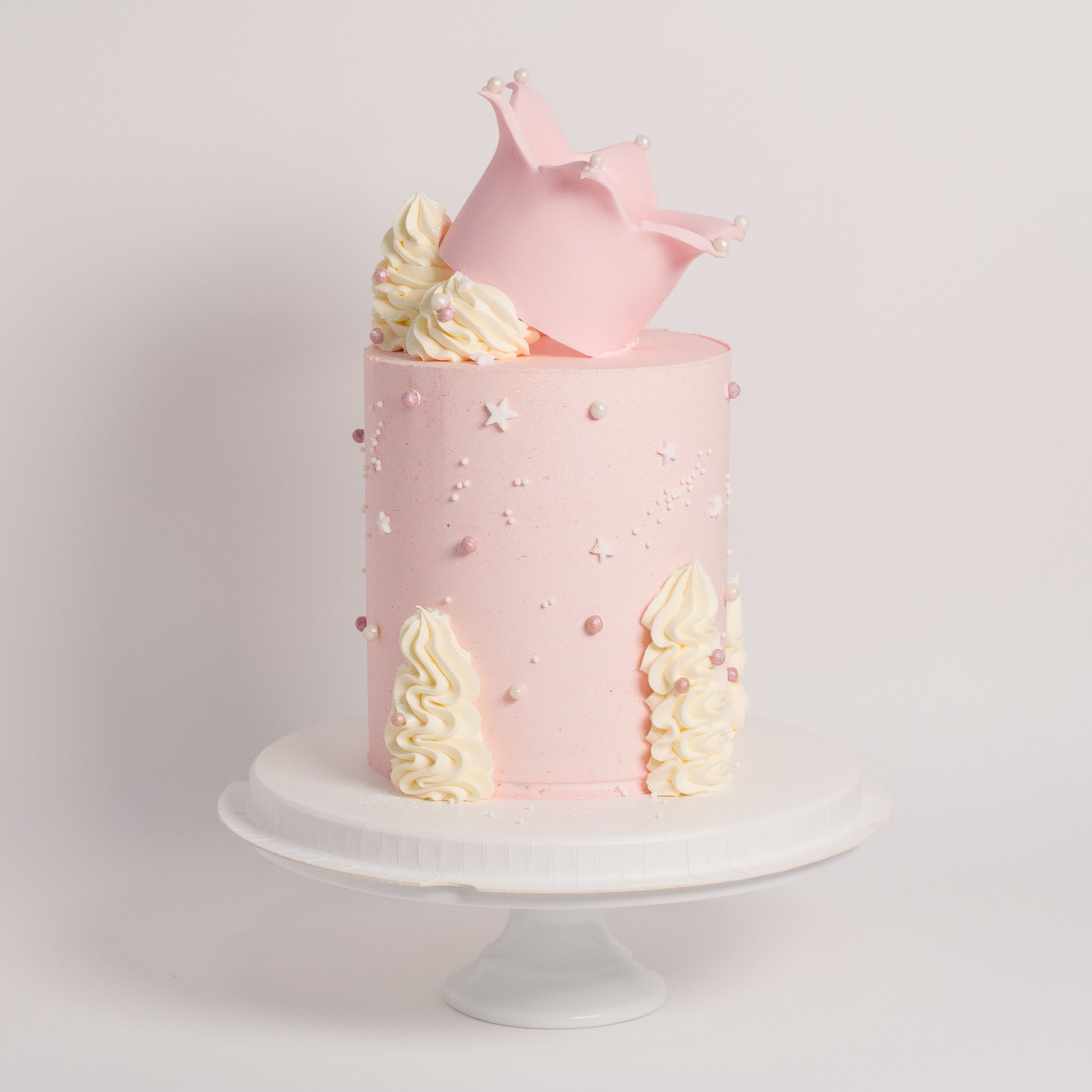 The Decorations: An icing crown sit on a cloud of buttercream swirls, while tiny stars and sweet crips pearl are scatted around the outside.
