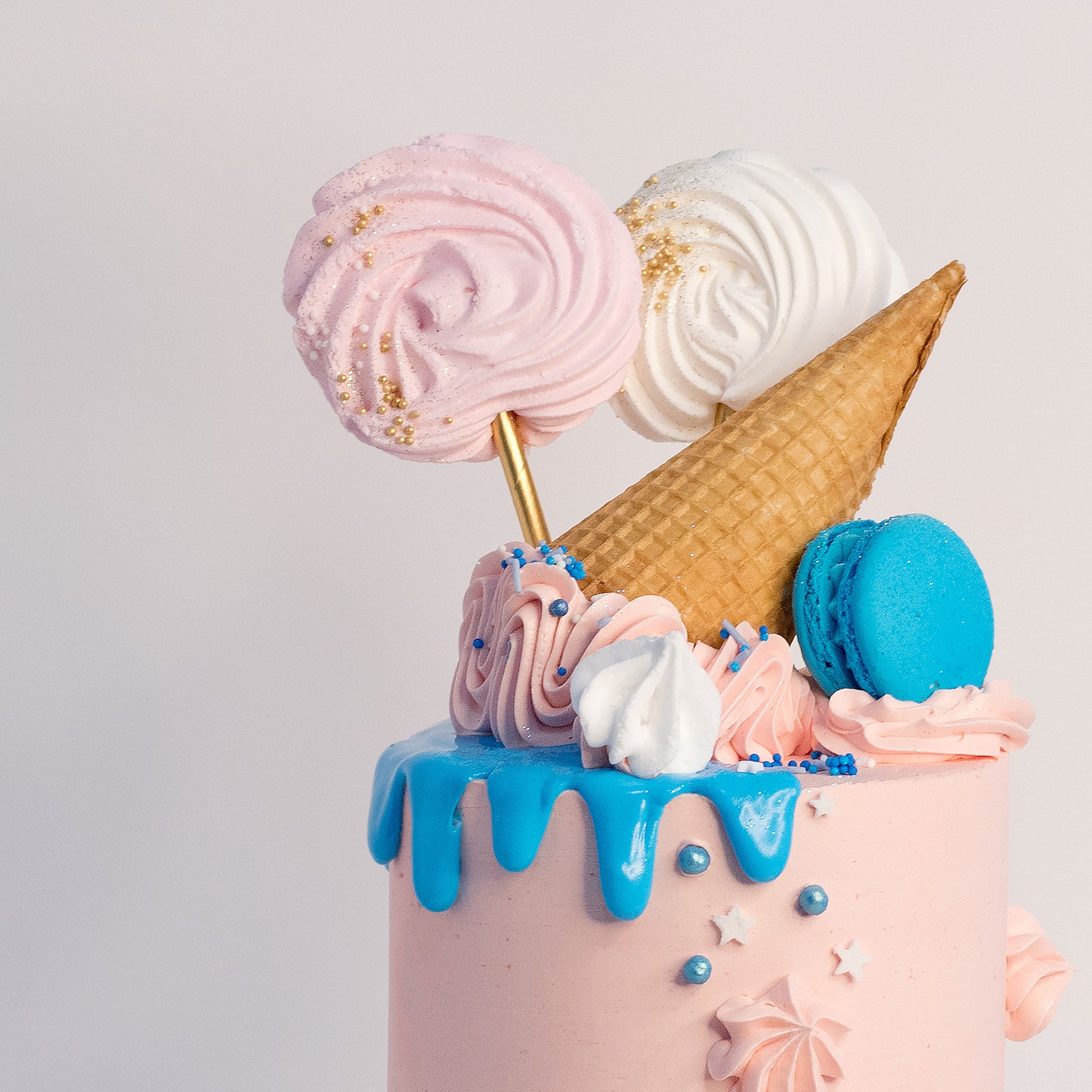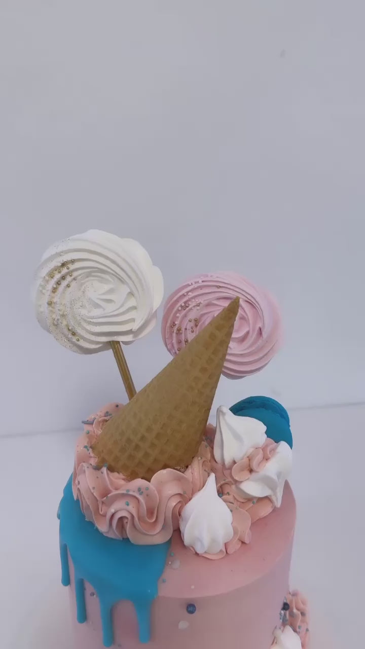 Meringue: Two meringue - white & pink- pops siting proud on the top, also smaller meringues and canoodling kisses are placed around and on top of the cake the cake.