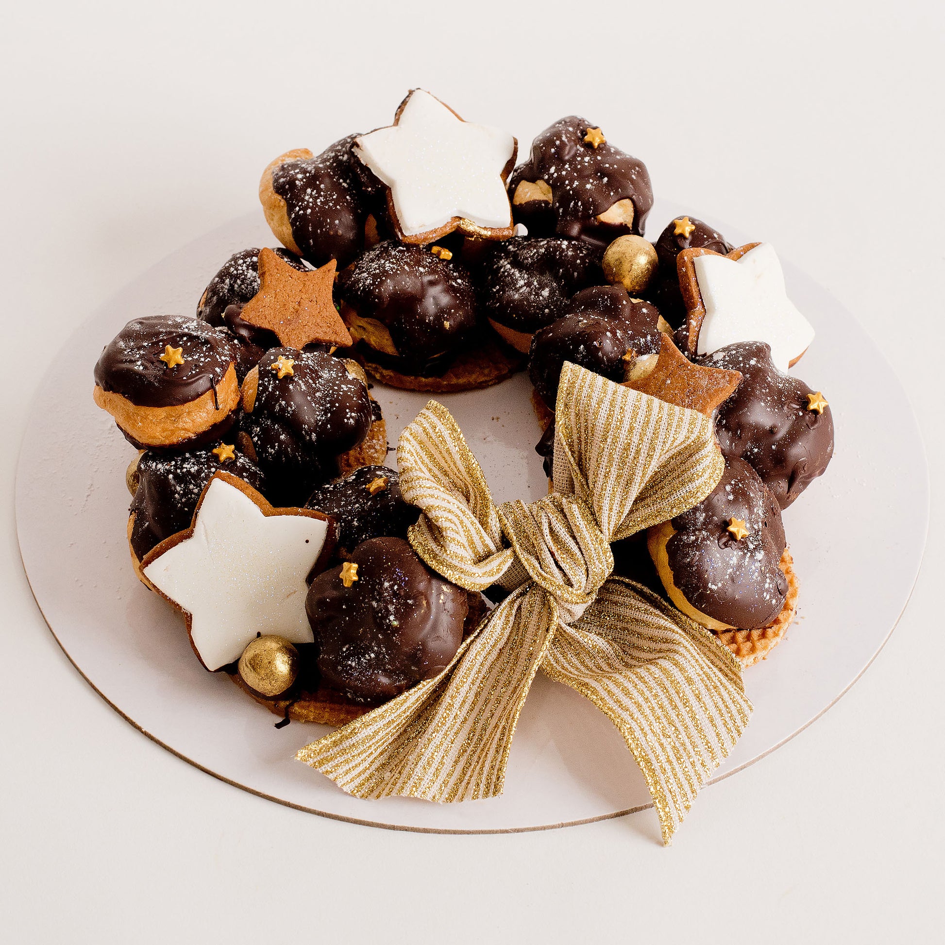 - Profiteroles Wreath: This wreath are made with, get-in-my-belly puffs of delicious-ness. Each choux pastry puff is filled with traditional custard dipped in chocolate, placed on a caramel filled wafer... but there's more, we then decorated with gingerbread, stars and golden maltesters.