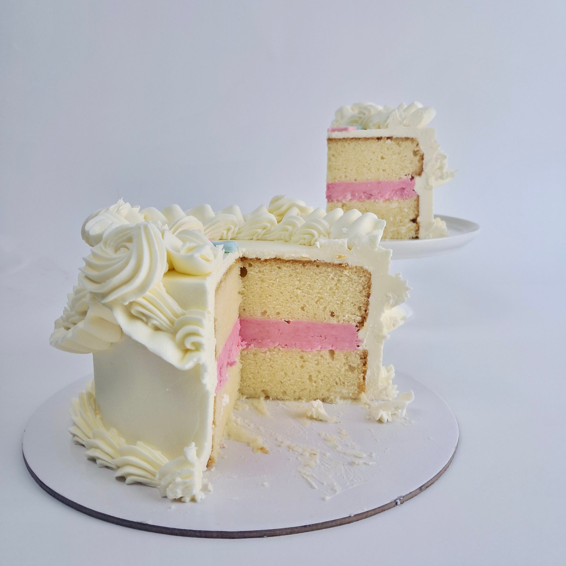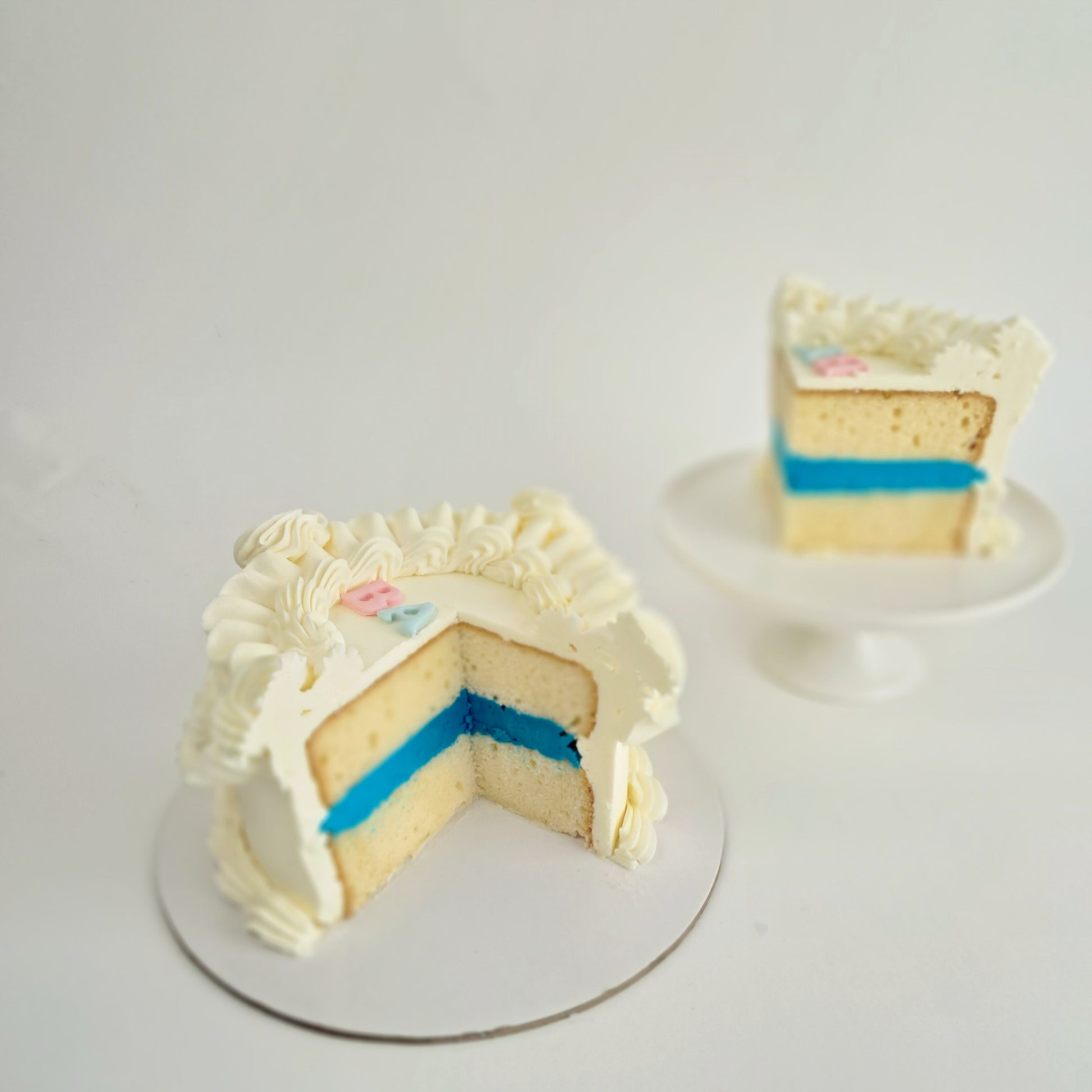 - The Inside: This delightful light Vanilla mini cake will serve up to 6 guests, The true magic of this cake lies within! Upon cutting the cake, the inside filling reveals a hidden surprise colour – either pink or blue – that announces the gender of your baby in the most delightful way. The moment of discovery will be a cherished memory for all your guests.