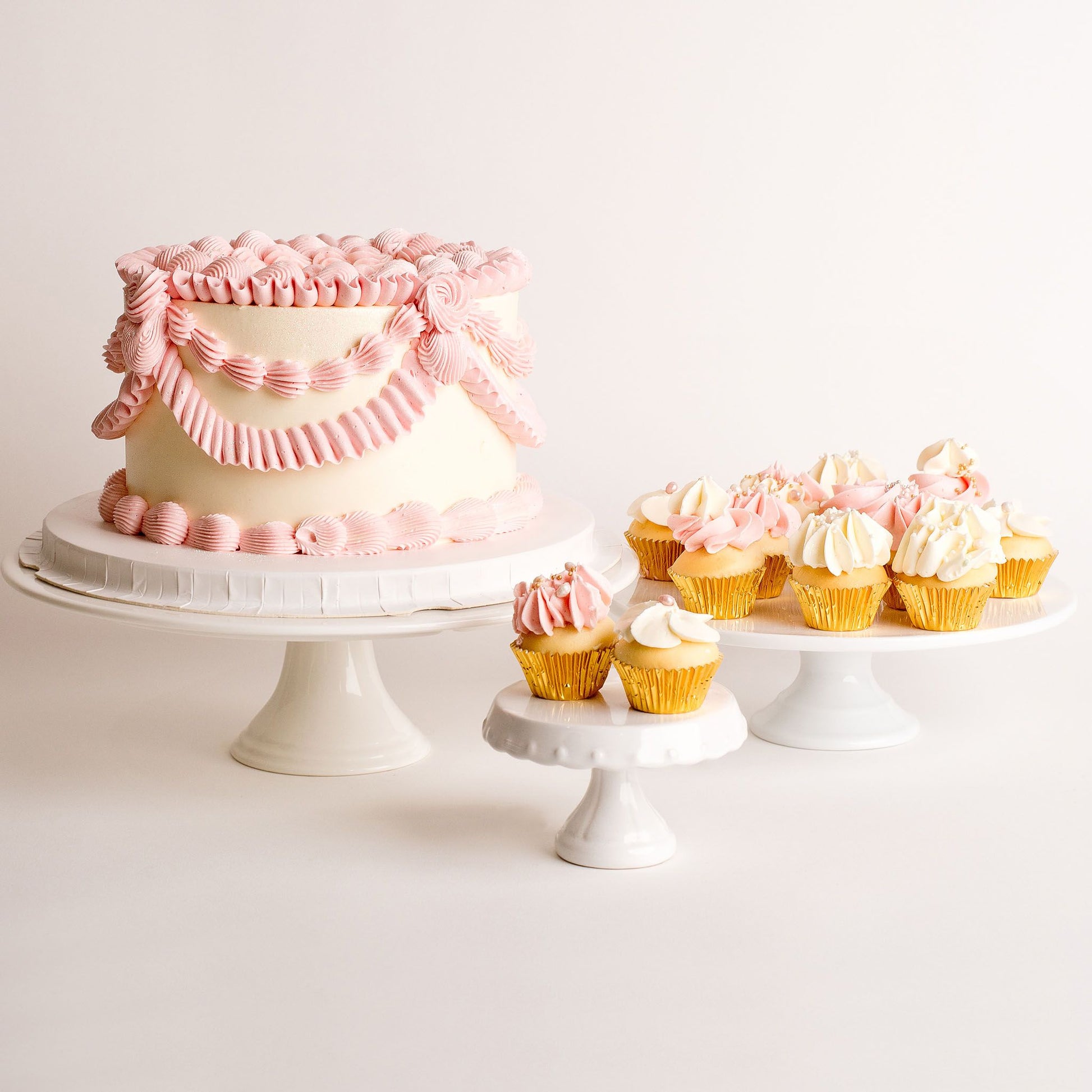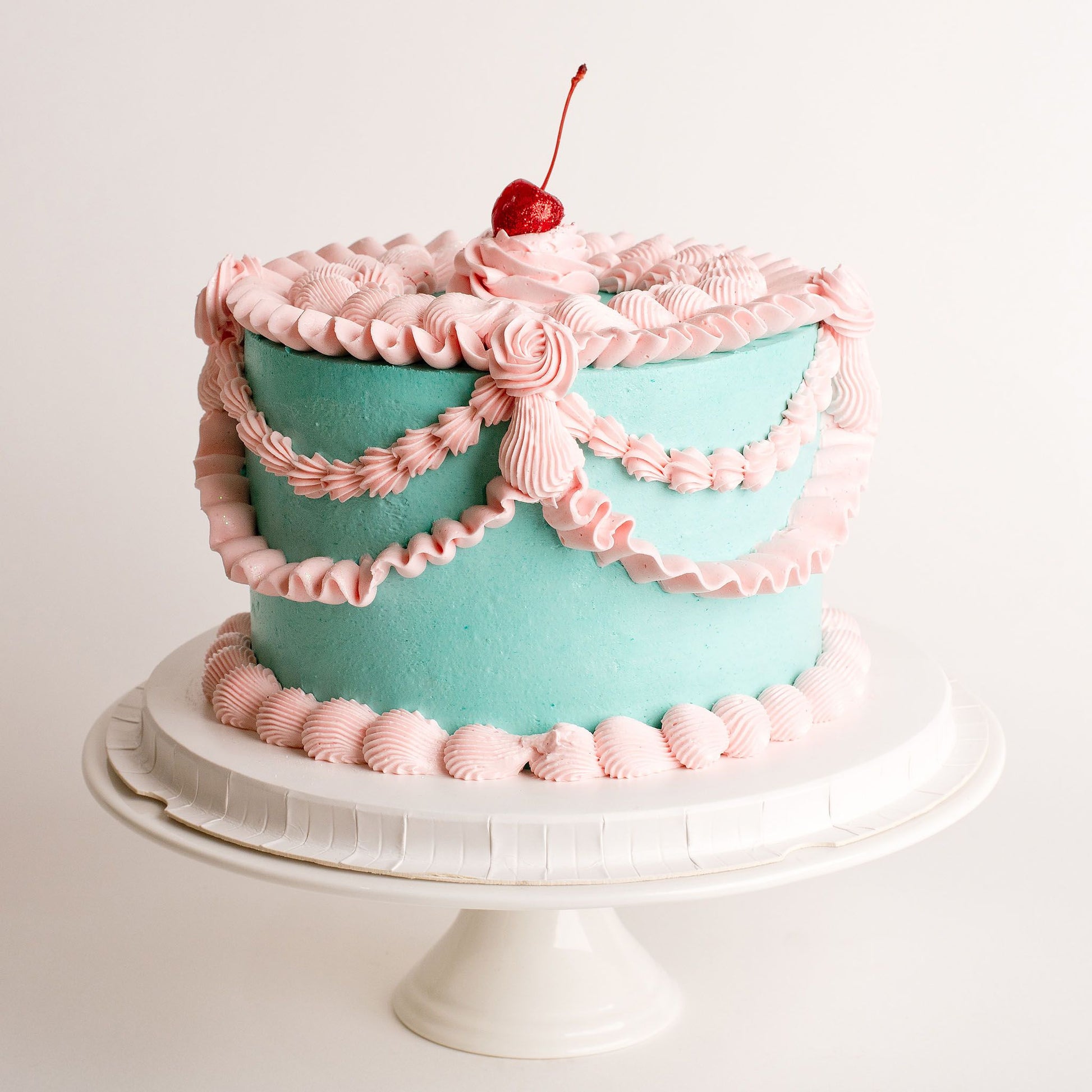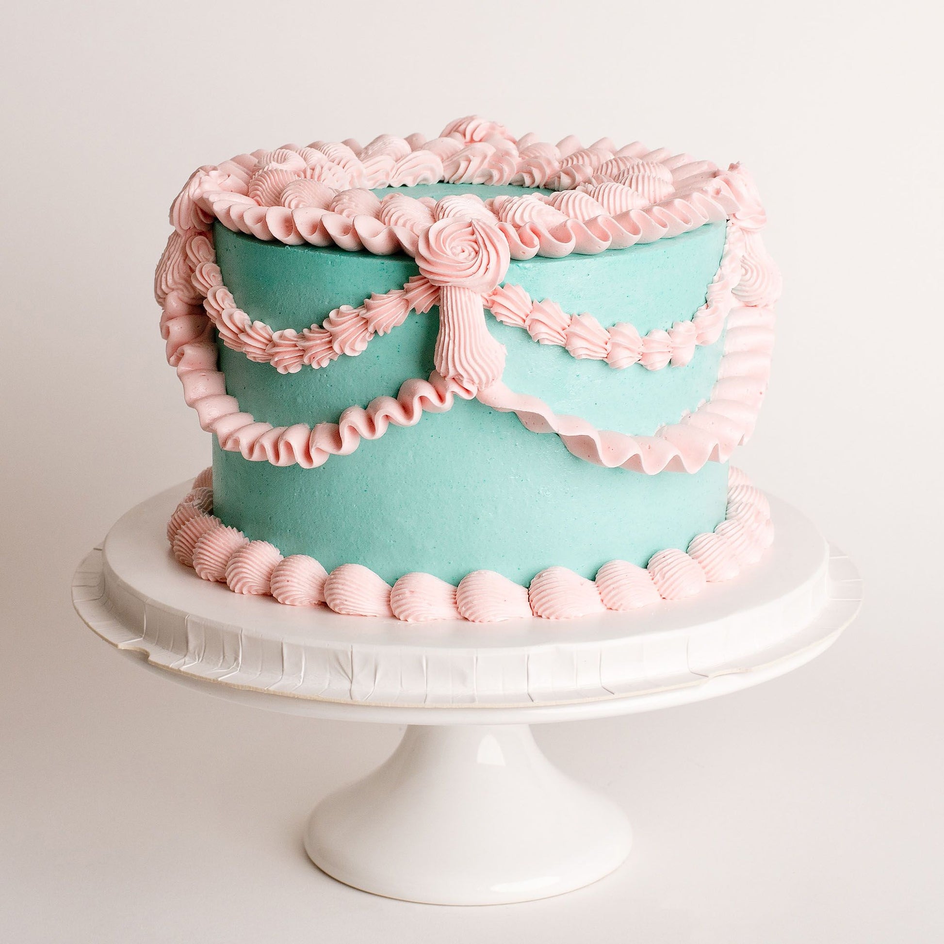 - Vintage Style Decorations: The cake is adorned with intricate vintage-style decorations. Each swirl, rosette, and delicate detail is hand-piped by our skilled cutie team. These elegant touches evoke a sense of nostalgia, making this cake a perfect centre piece for any vintage-themed celebration. There is also room on the top to add a topper.