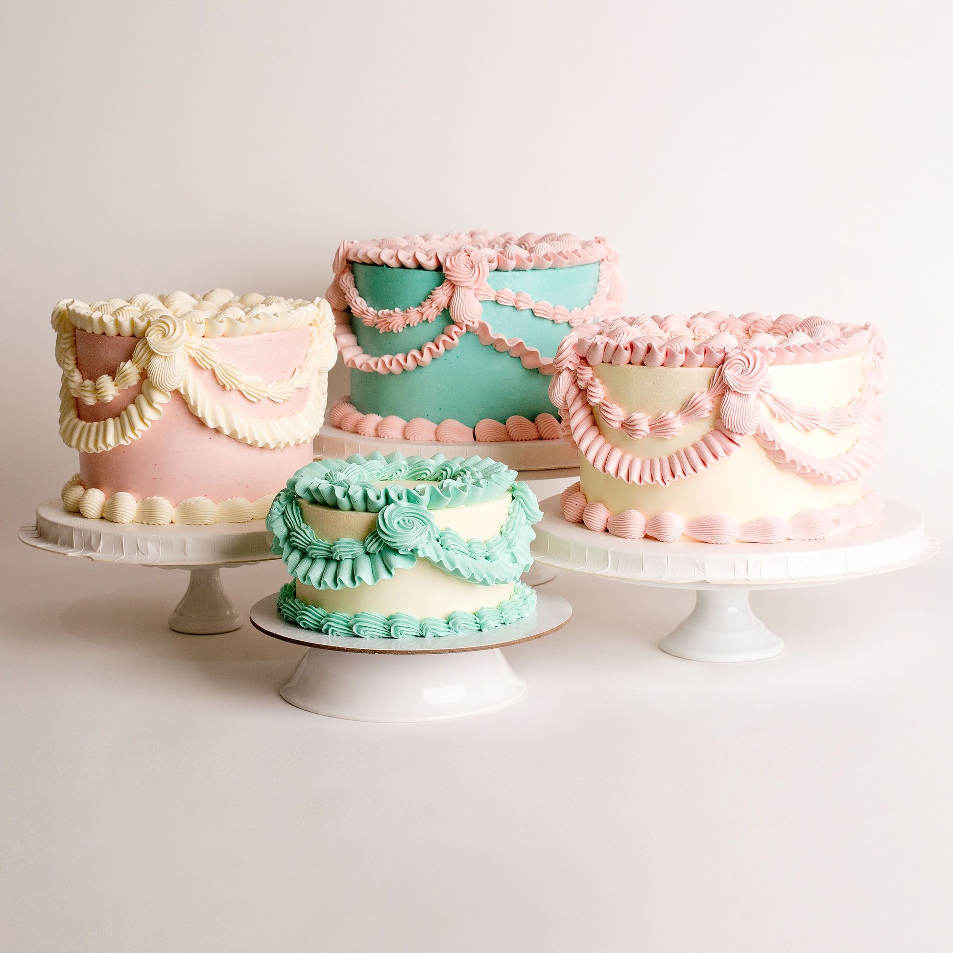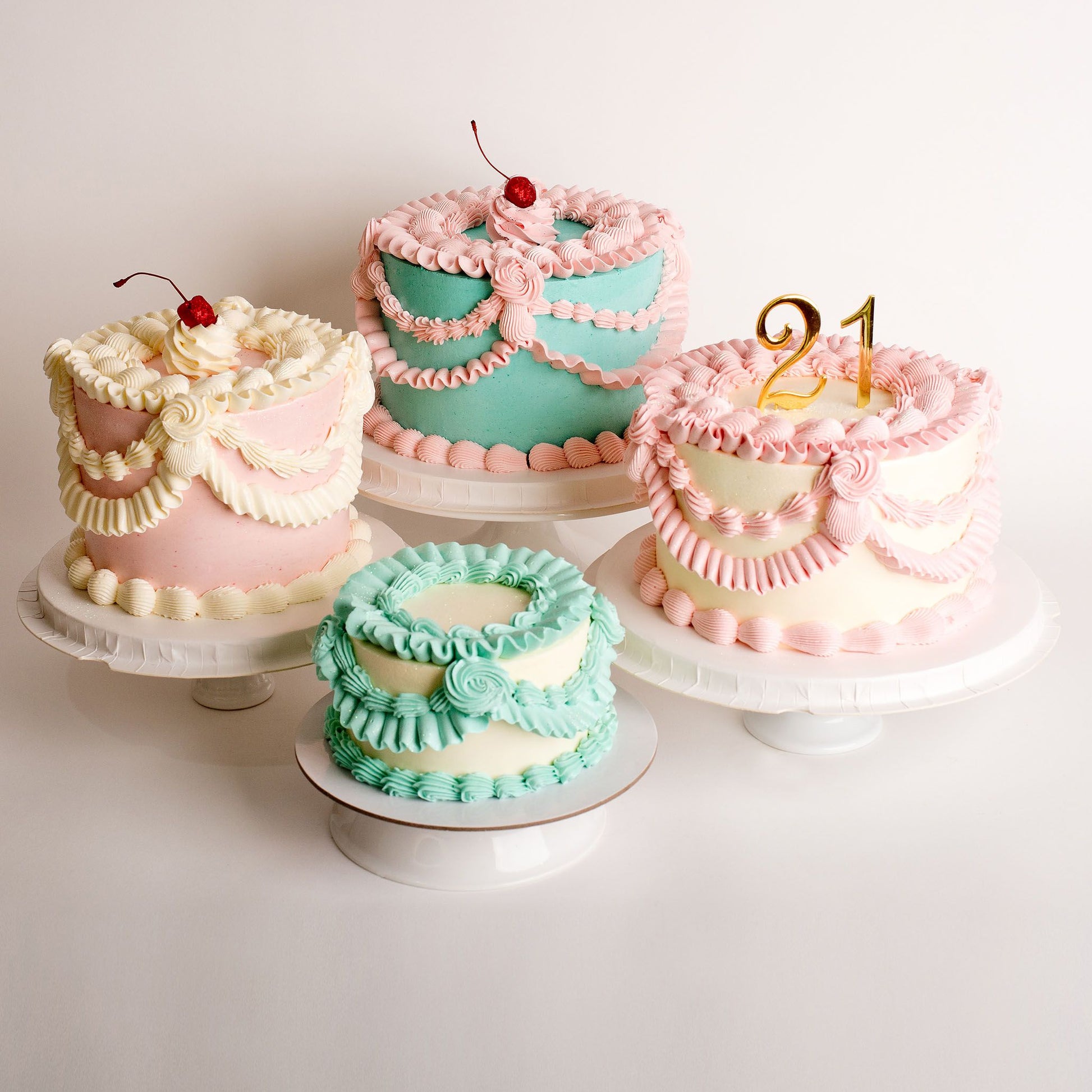 All cakes are decorated in "not too sweet" vanilla dairy-free frosting.